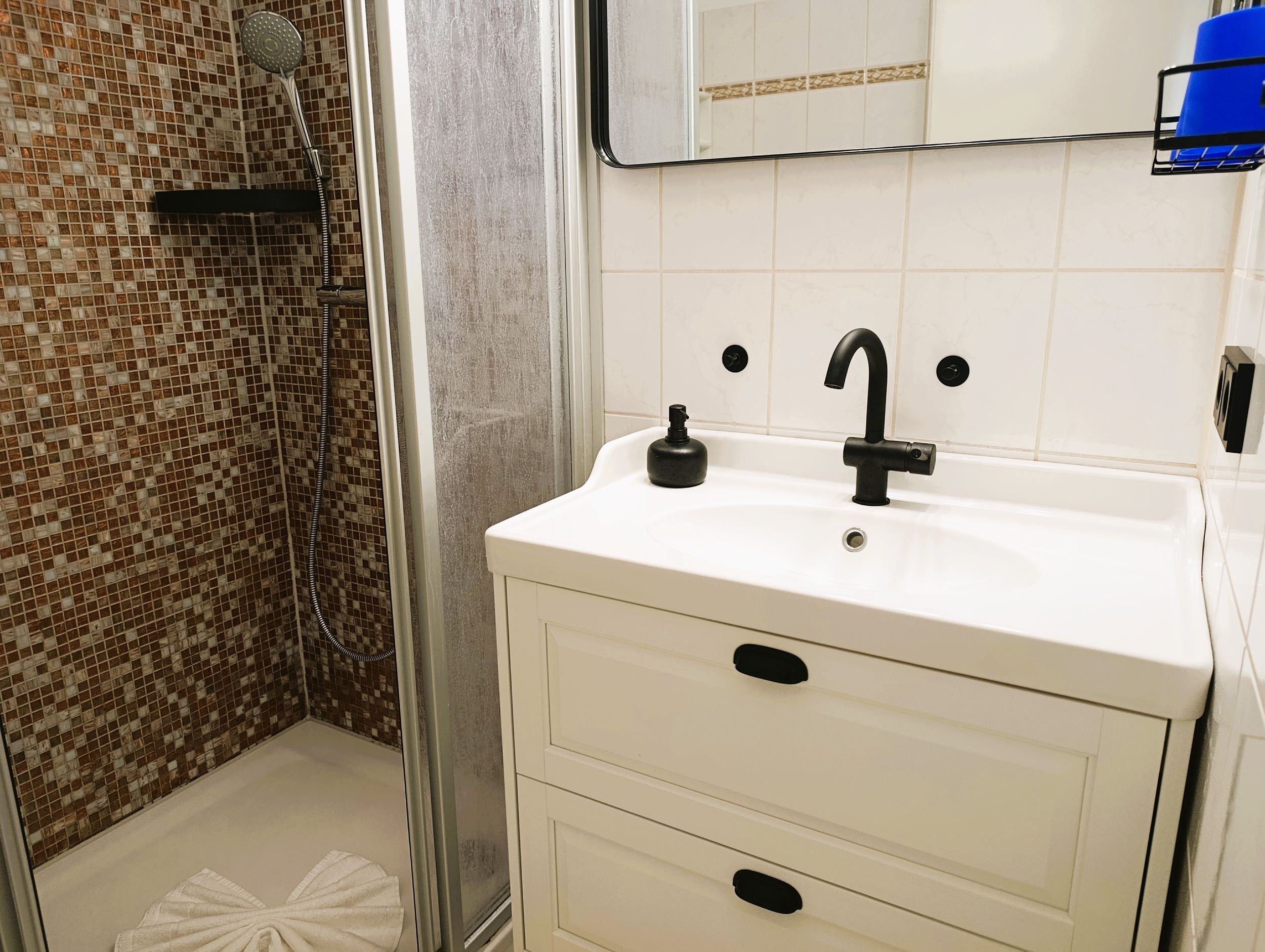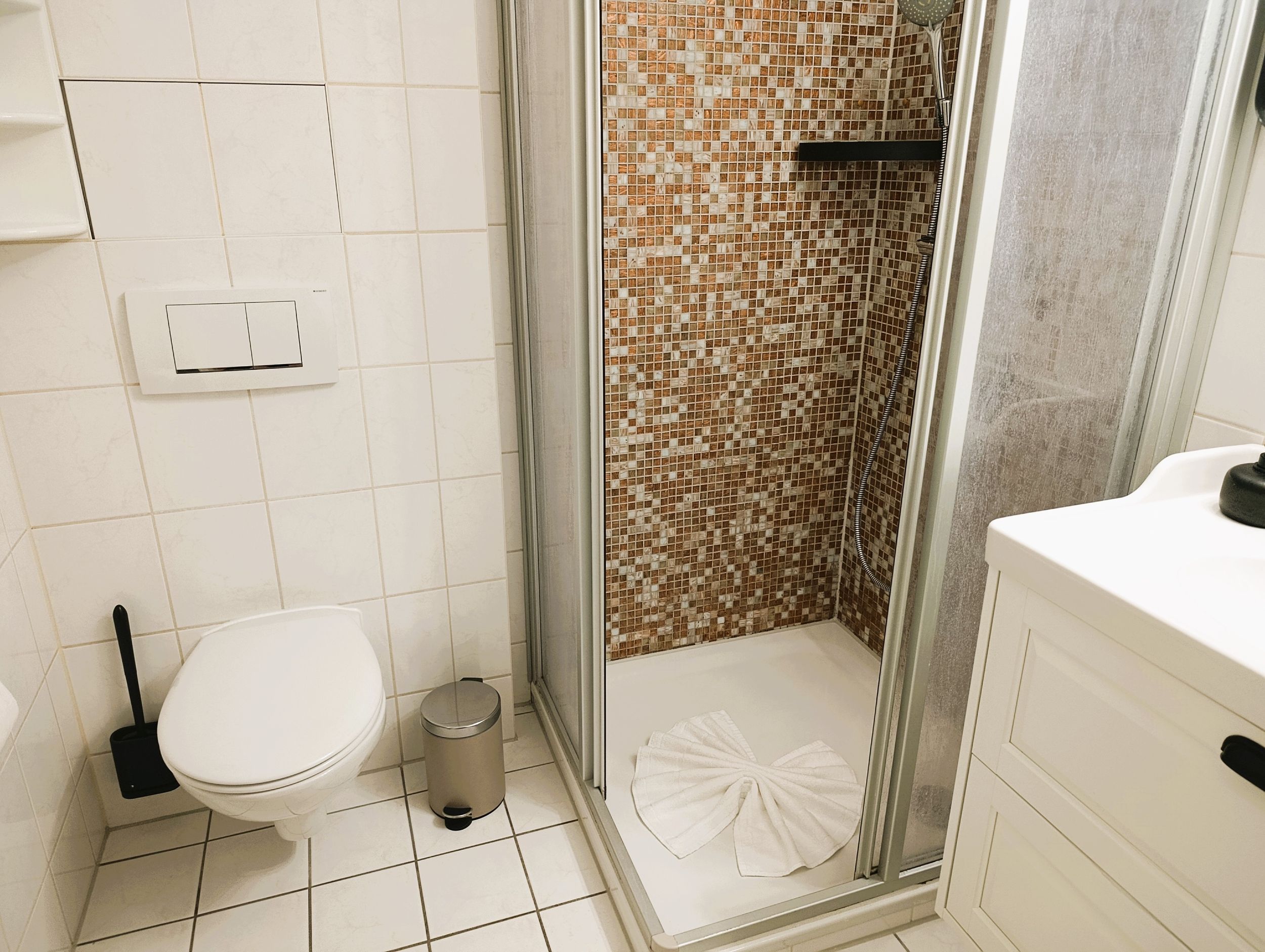 - Bad mit neuer Dusche (niedriger Duscheinstieg), WC, Spiegelschrank und Föhn
