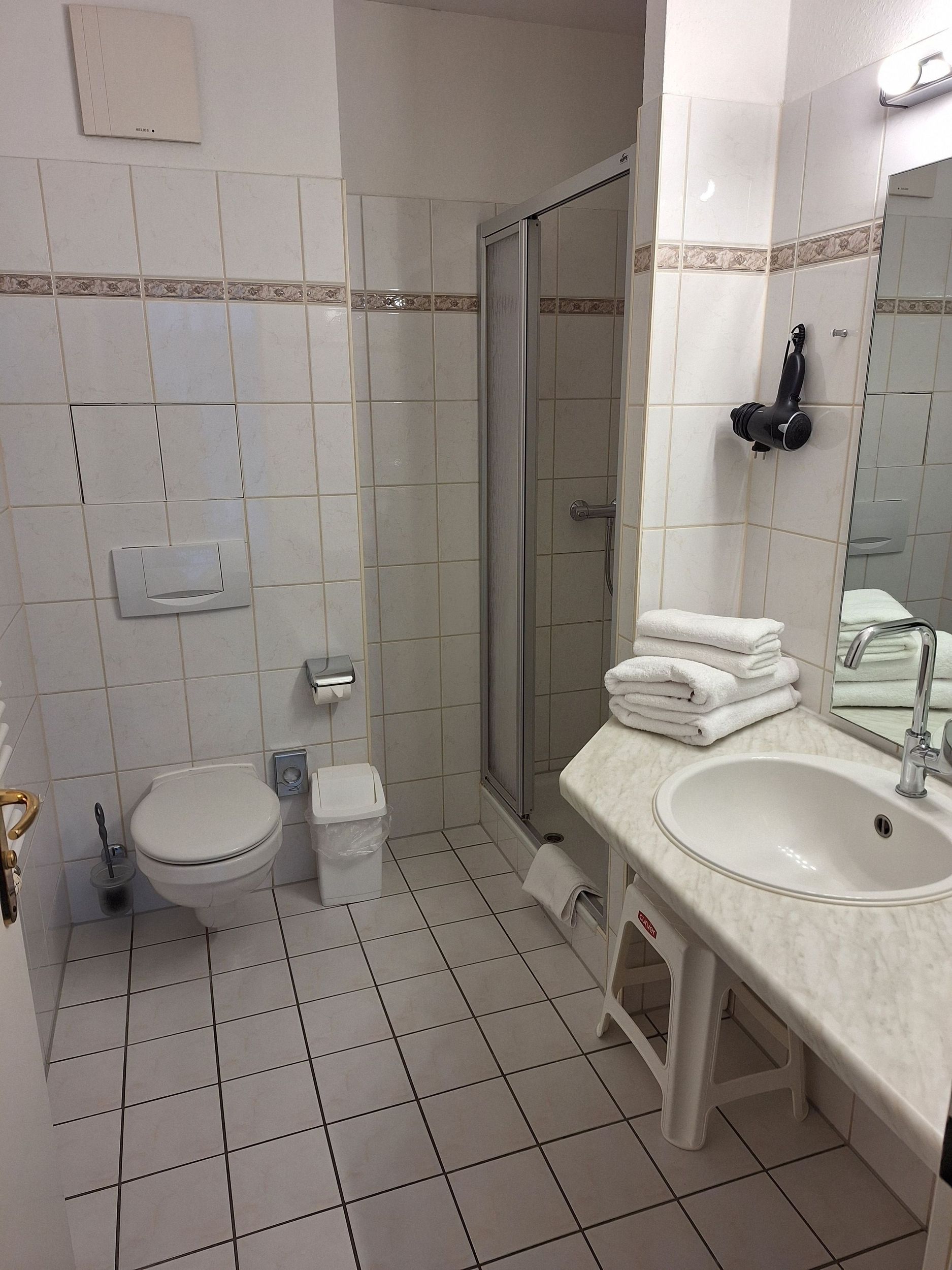 - Badezimmer mit Dusche, WC, Waschbecken, Spiegel und Föhn