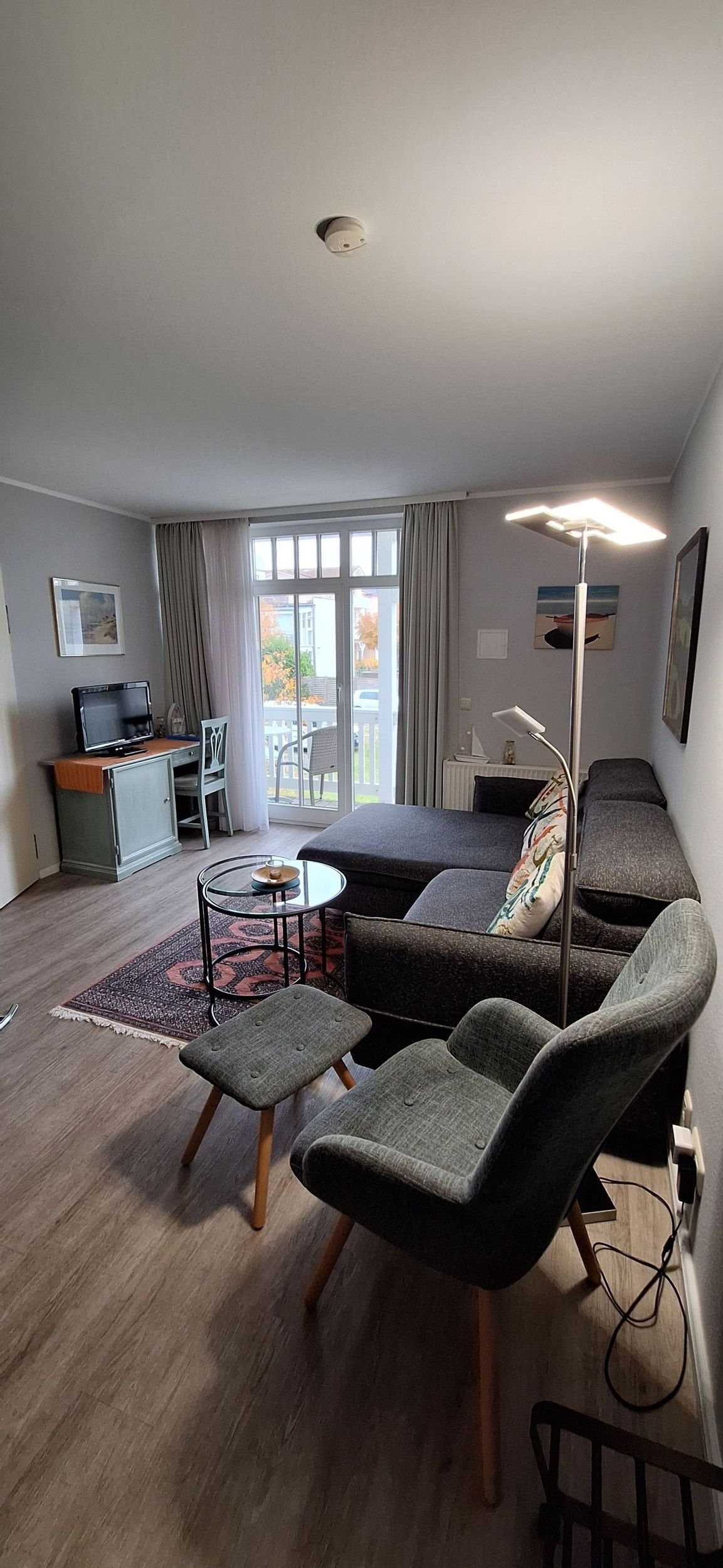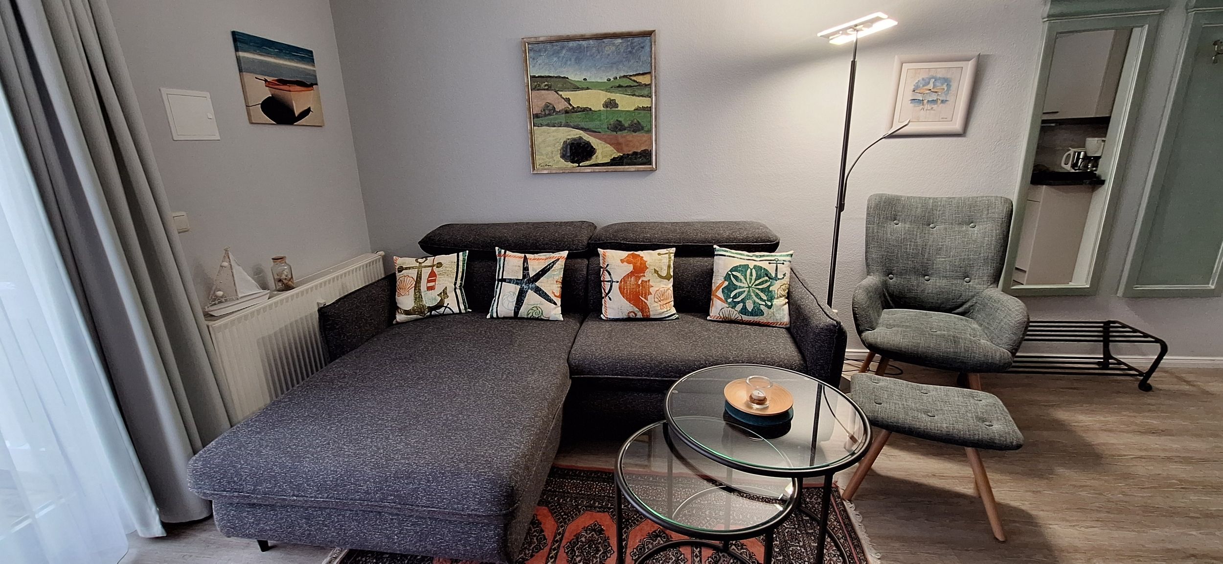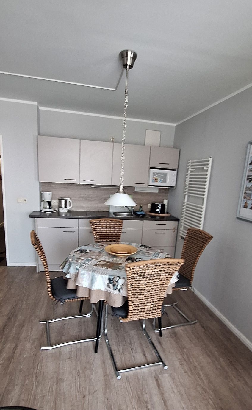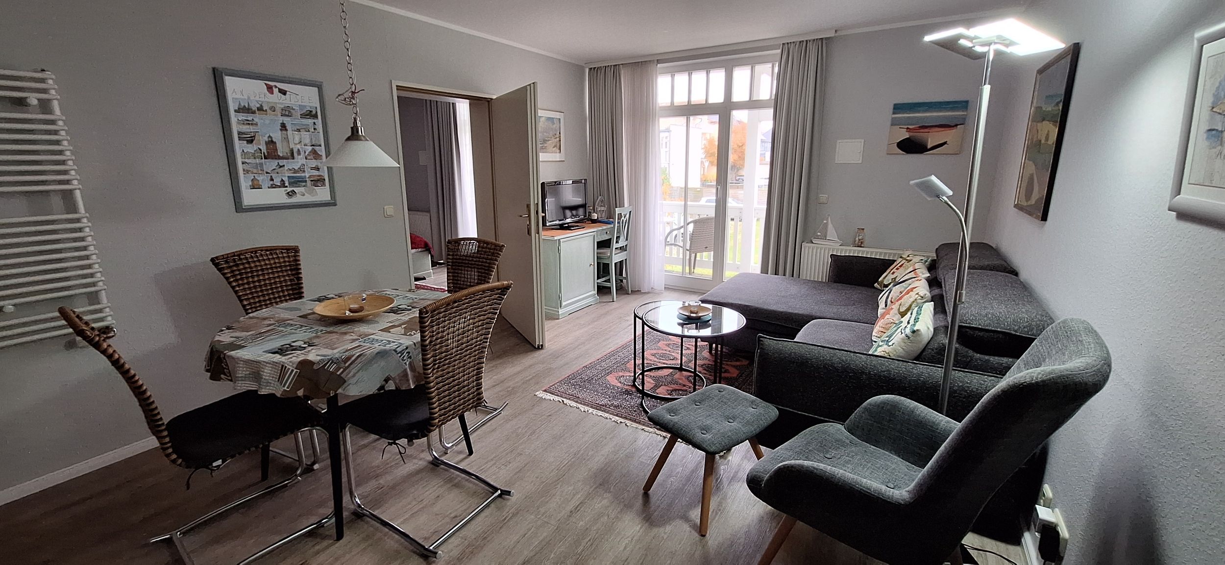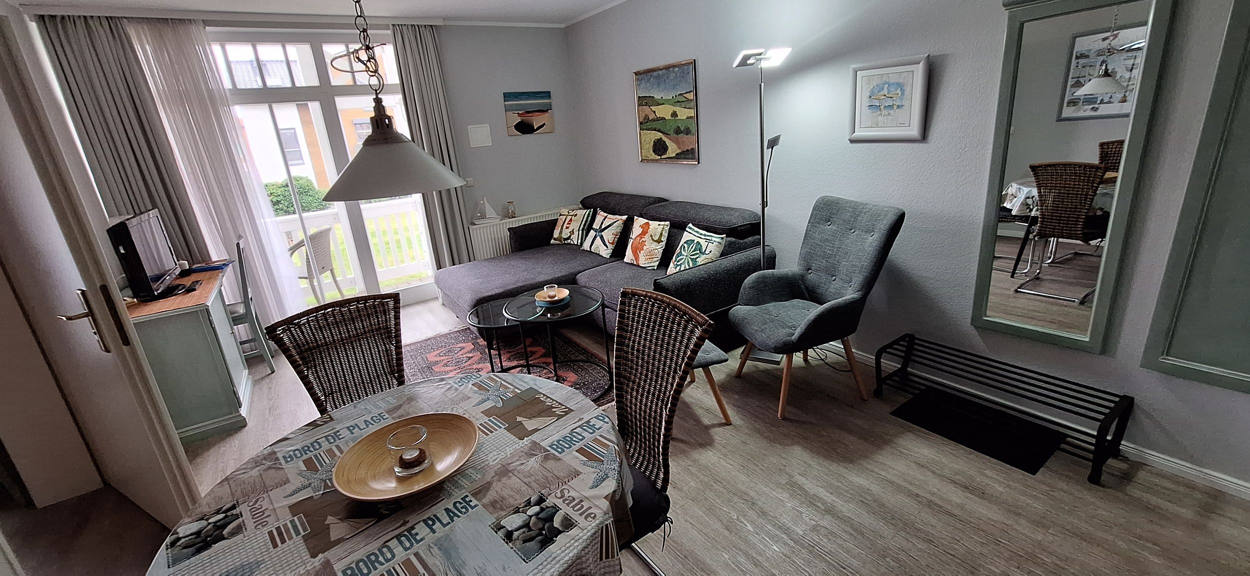 Die ca. 40 qm große, helle Ferienwohnung liegt in der I. Etage und ist mit Fahrstuhl erreichbar, hat neben dem Wohnbereich, eine geräumige Essecke, ein Schlafzimmer, eine Küchenzeile sowie ein großes Duschbad und einen großen Balkon.