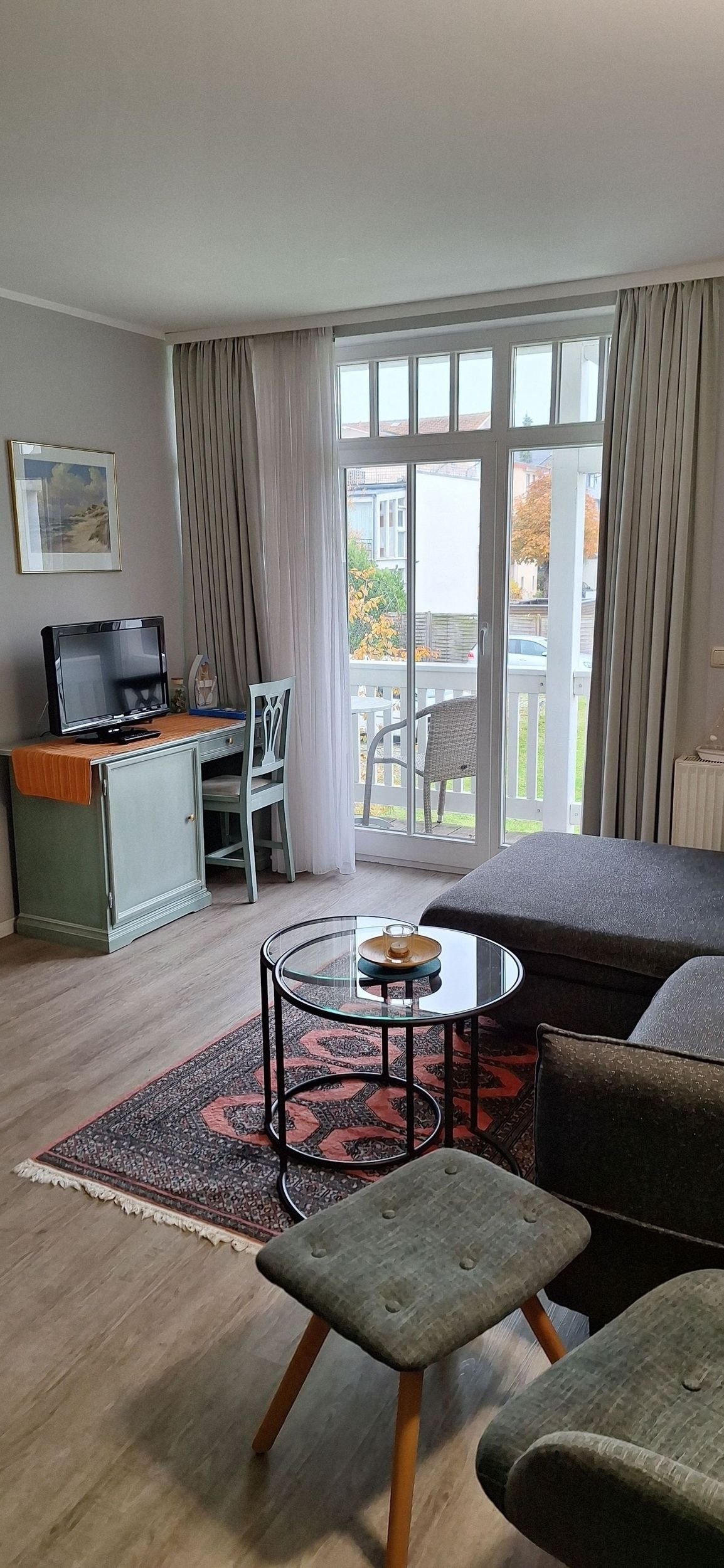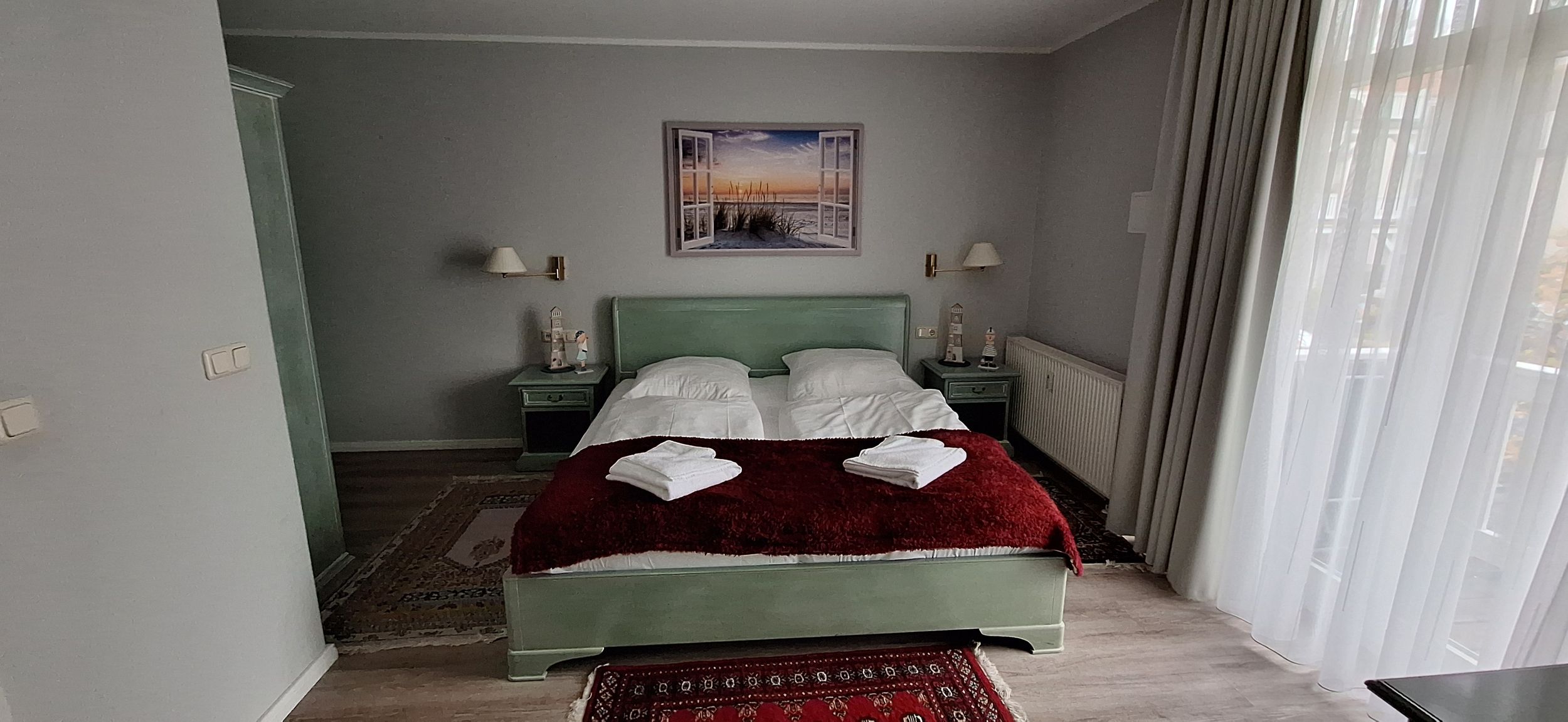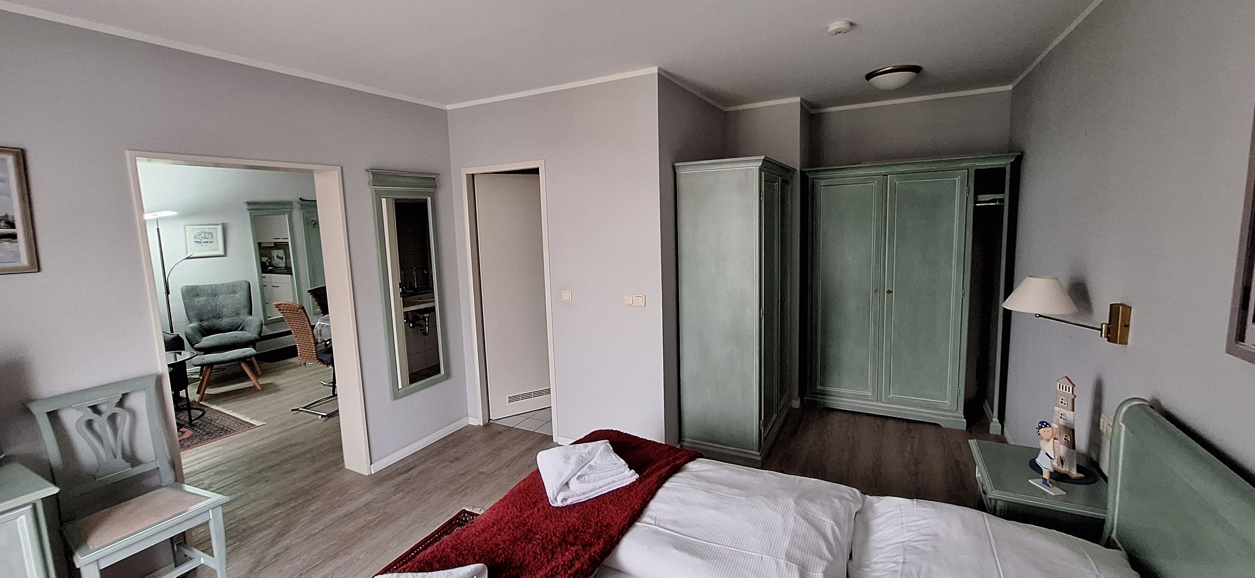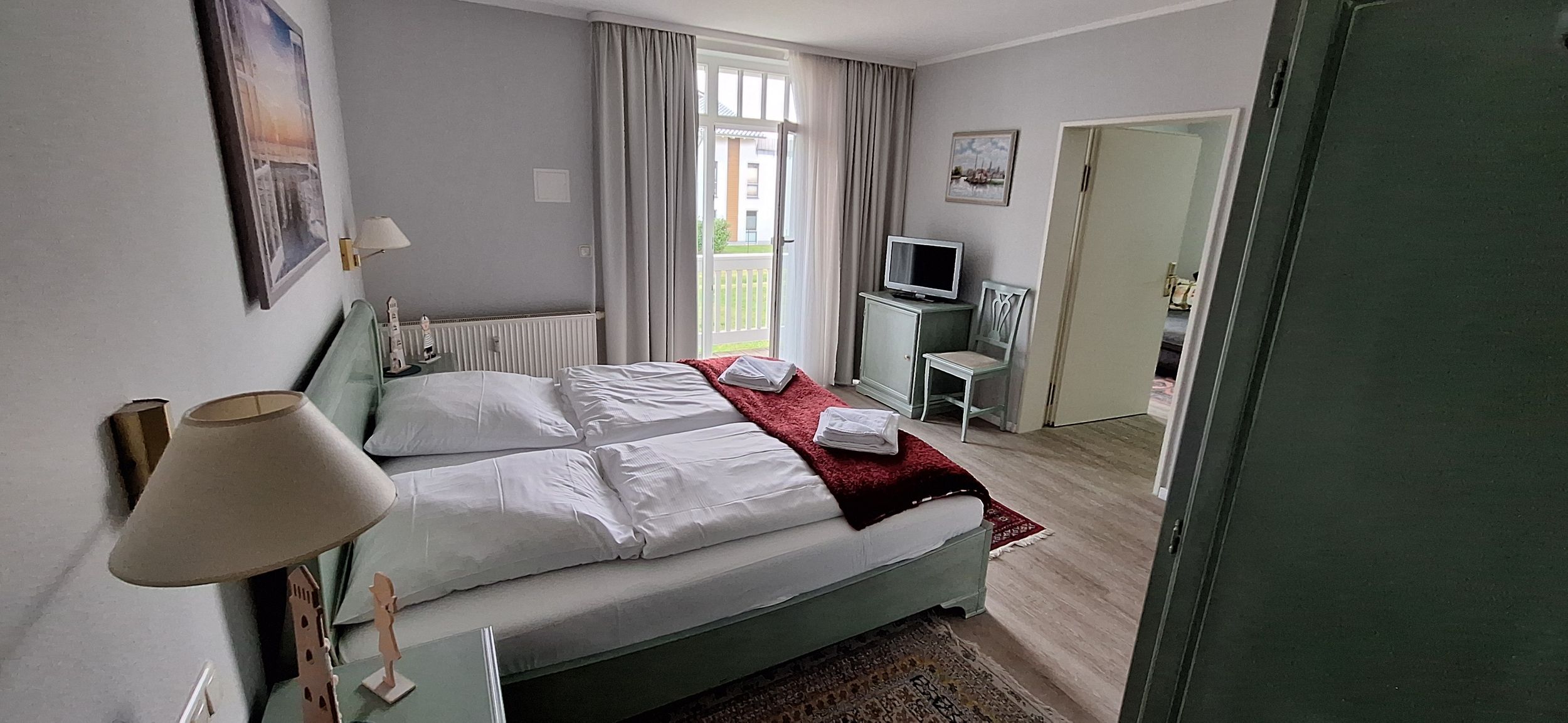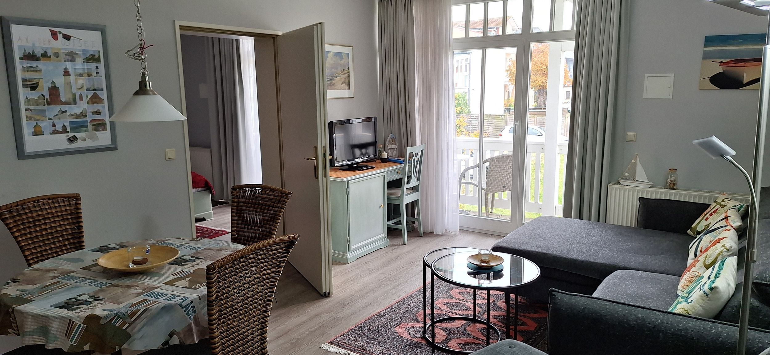 Die ca. 40 qm große, helle Ferienwohnung liegt in der I. Etage und ist mit Fahrstuhl erreichbar, hat neben dem Wohnbereich, eine geräumige Essecke, ein Schlafzimmer, eine Küchenzeile sowie ein großes Duschbad und einen großen Balkon.