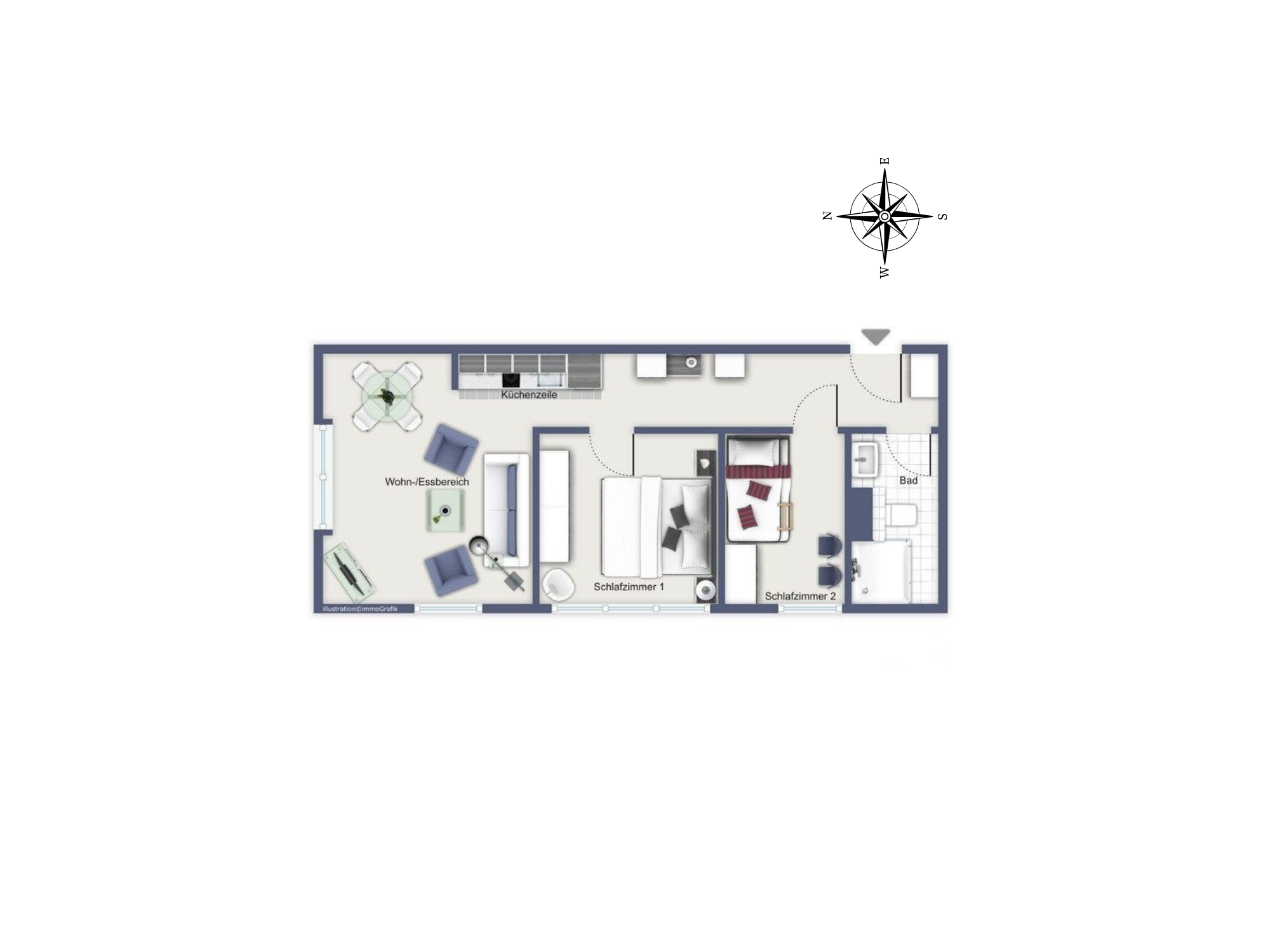 Die ca. 60 qm große Ferienwohnung liegt in der IV. Etage, hat neben dem Wohnbereich mit Küchenzeile zwei Schlafzimmer, sowie ein Duschbad, Ecke Westseite mit Meeresblick.