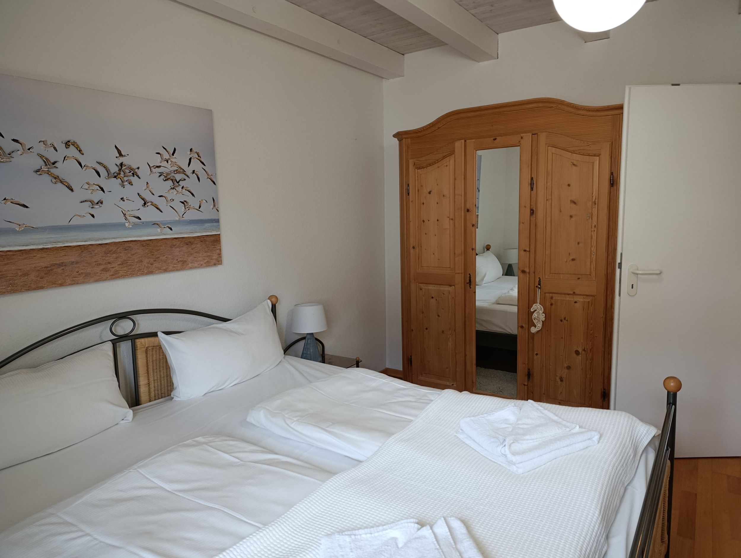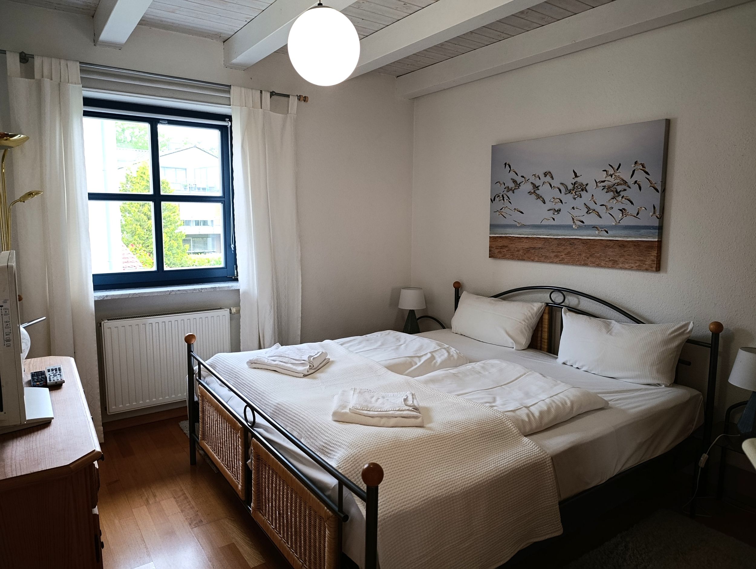 Die ca. 73 qm, neu eingerichtete große Ferienwohnung liegt in der I. Etage, hat neben dem Wohnbereich mit Küchenzeile noch ein Schlaf- und ein Gästezimmer sowie ein Duschbad und einen Balkon zur Ostseite.