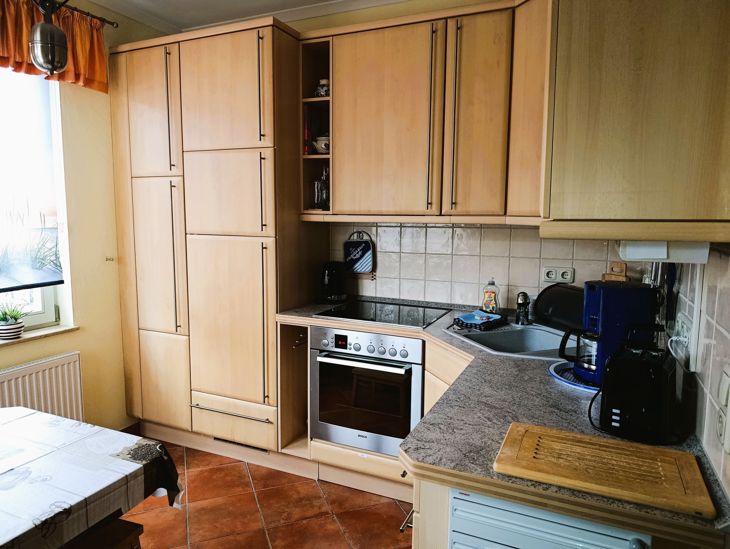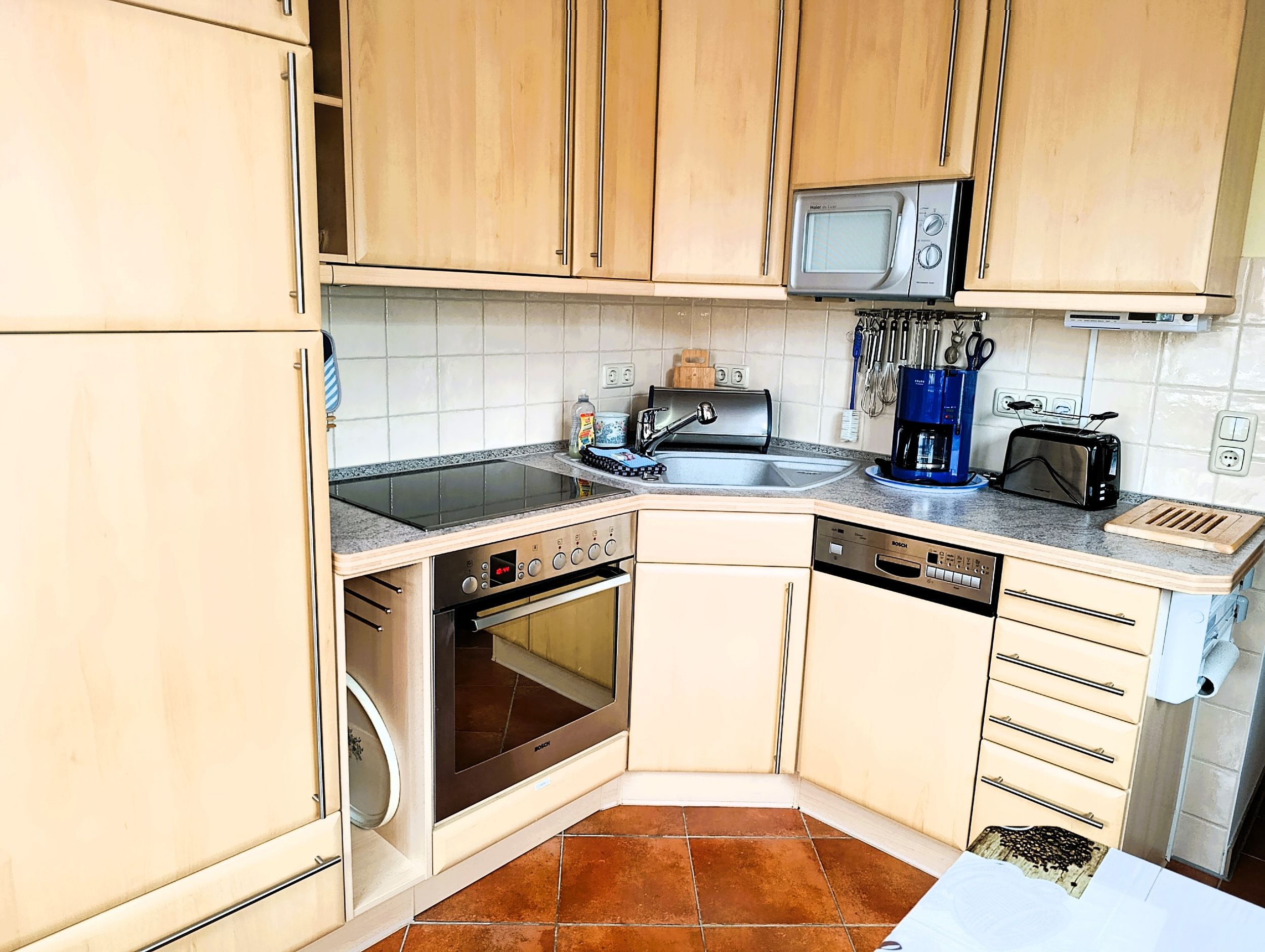 Küche mit Ceranfeld, Kühlschrank mit Gefrierfach, Mikrowelle, Kaffeemaschine, Wasserkocher, Toaster und Geschirrspüler